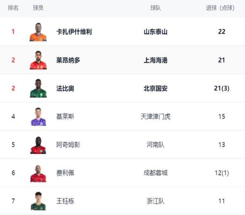 中超第27轮火热进行,强队纷纷获胜。上海海港和青岛海牛展开进球大战,结果上海海港笑到了最后,以4-3击败了青岛海牛,保住了榜首位置。这场比赛巴西外援莱昂纳多表现出色,他独造3球,包括2进球1助攻,是球队获胜的最大功臣。莱昂纳多连续4场联赛打进了8球。凭借时间的不断进球,让莱昂纳多在射手榜名次不断攀升,已经来到了第2的位置。