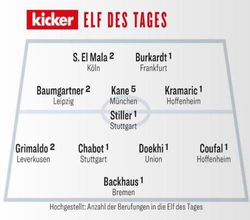 拜仁慕尼黑前锋凯恩本赛季第5次入选最佳阵容,和多家球队传出绯闻的科隆天才攻击手赛义德·马拉第2次入选,为法兰克福梅开二度的伯克特则本赛季首次入选。